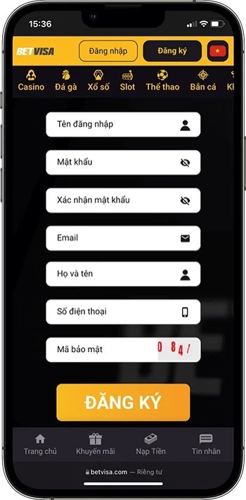 Bạn nhập đầy đủ các thông tin cần thiết mà nhà cái yêu cầu: tên đăng nhập, mật khẩu, xác nhận mật khẩu, Email, Họ tên, số điện thoại, mã bảo mật.